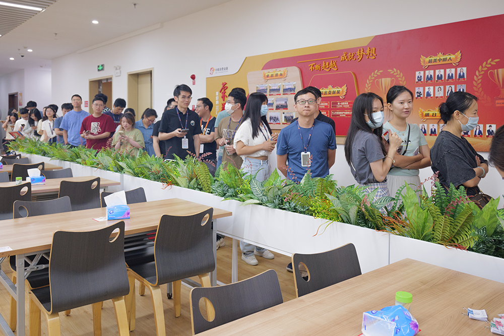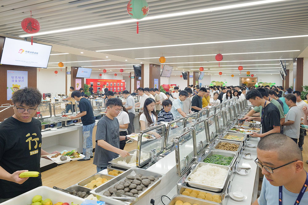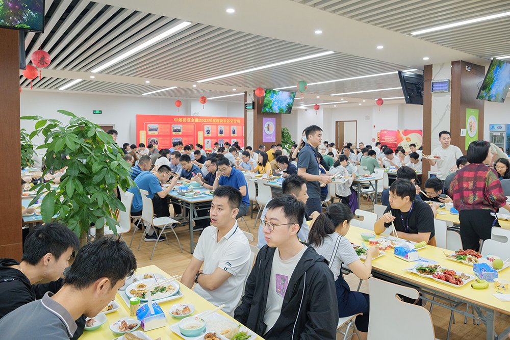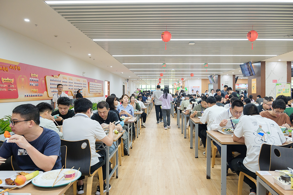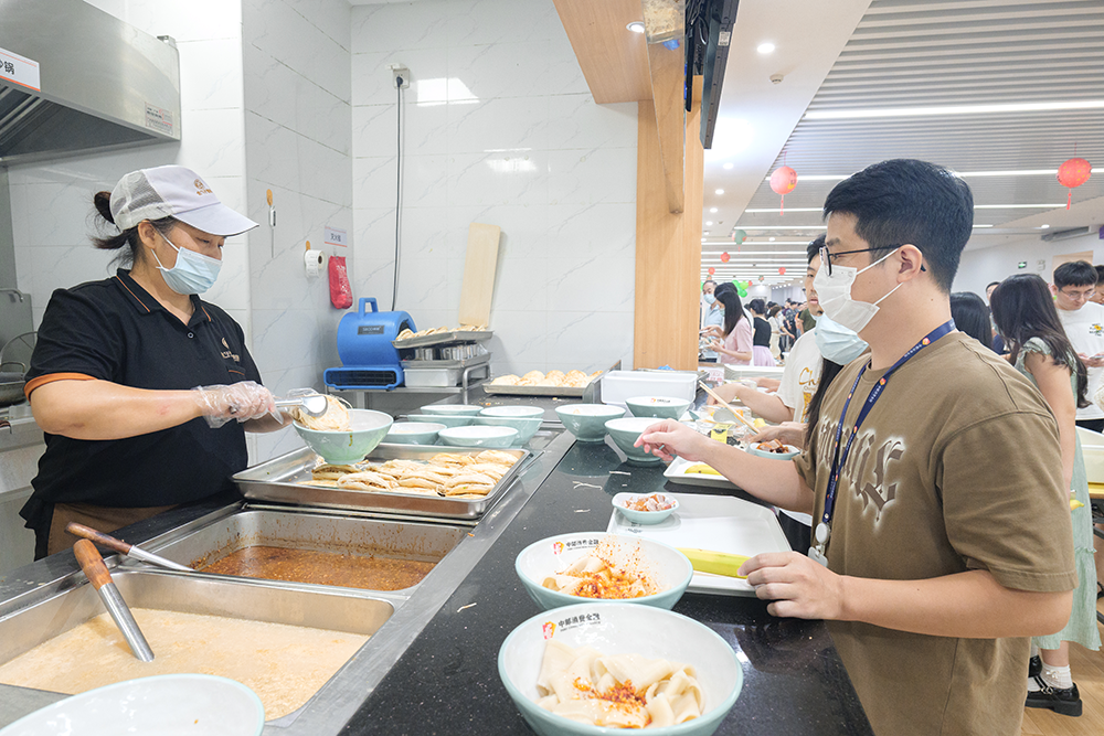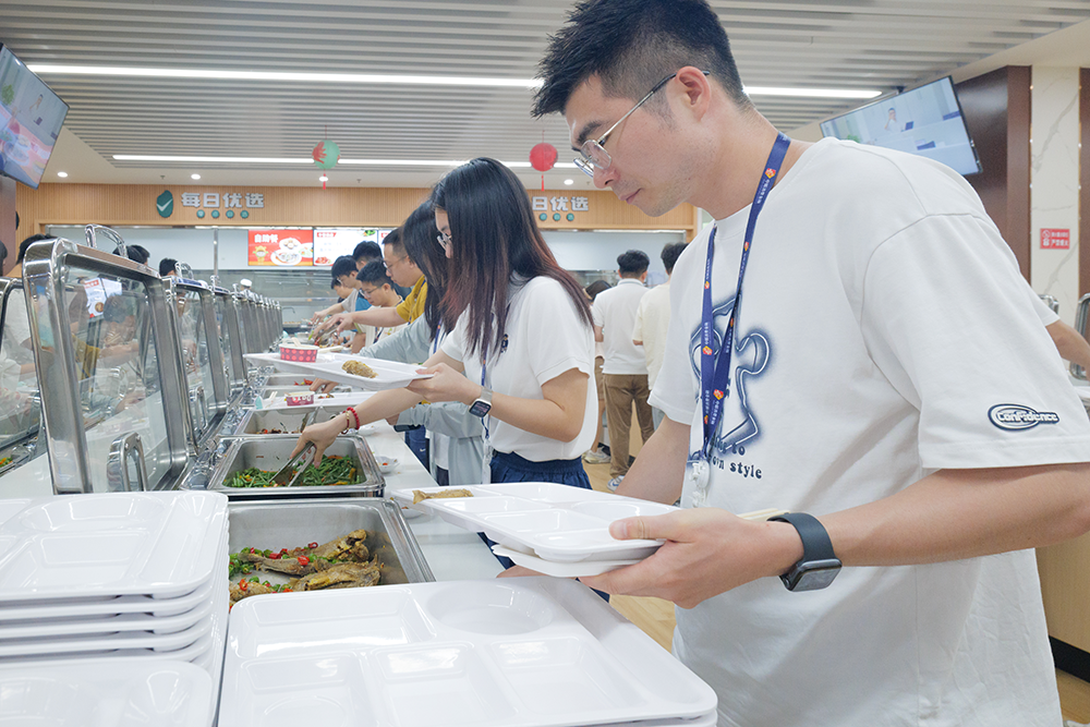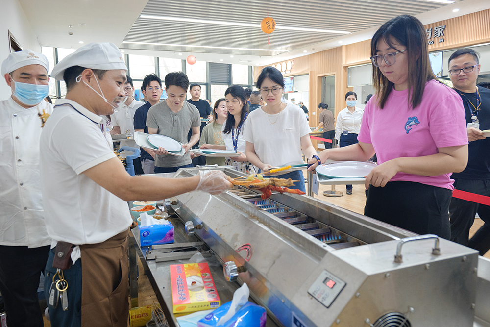 职工们有序领取美食后,围坐在餐桌旁,品尝着美食,脸上洋溢着满足和幸福的笑容。他们相互分享着美食的故事,食堂内弥漫着温馨愉快的氛围。